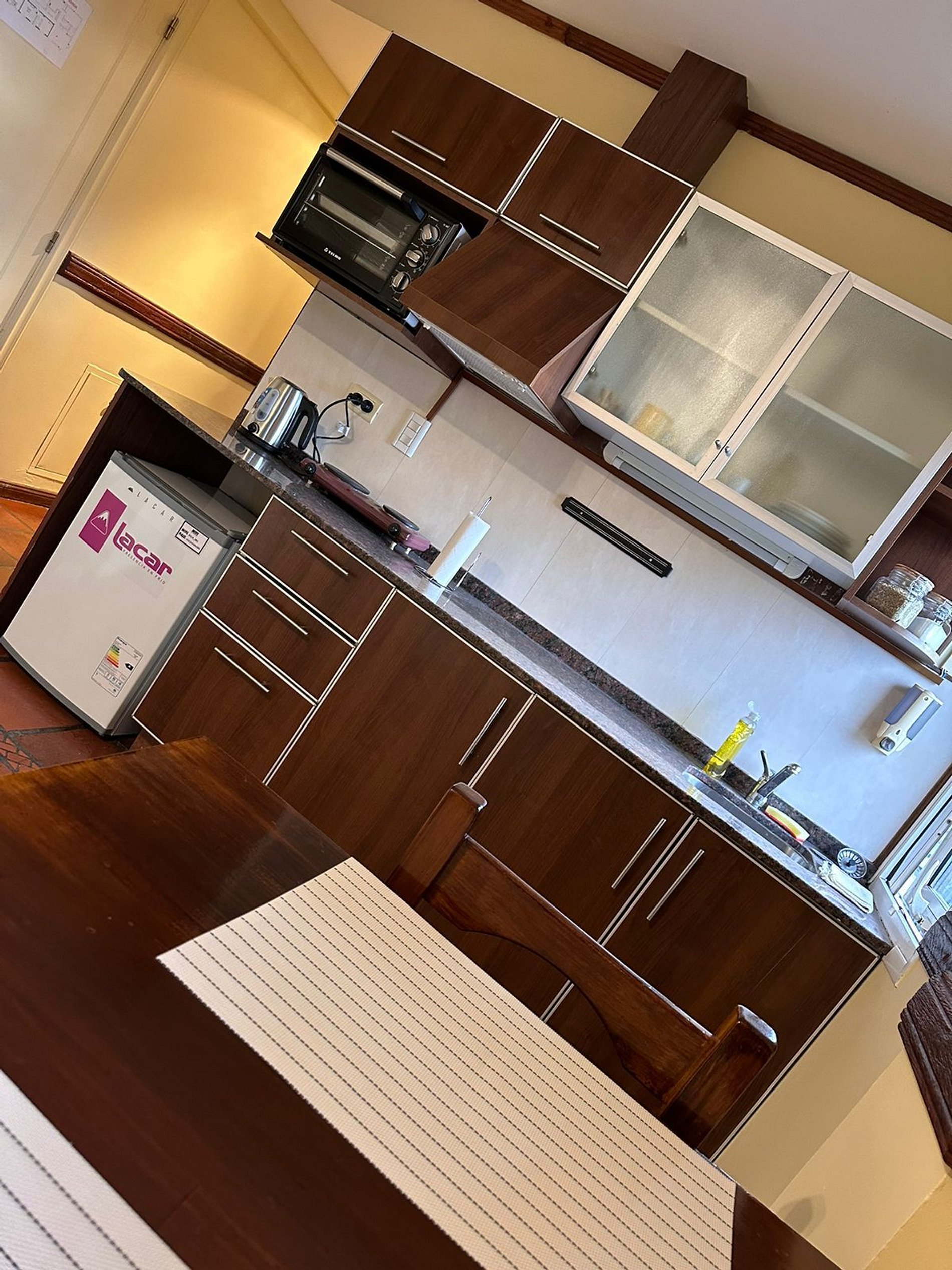 It has a small kitchen with a stove for cooking. A nice living area. Access by elevator or staircase Someone will be waiting for you on the day of arrival to give you the keys.